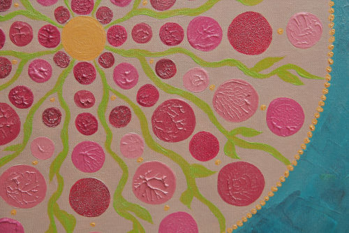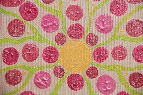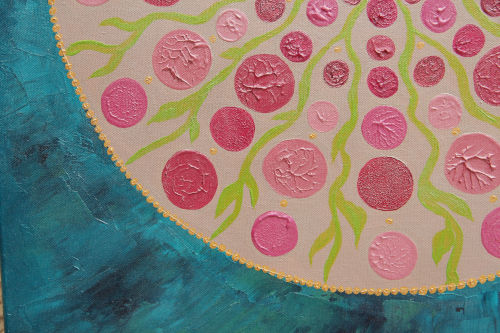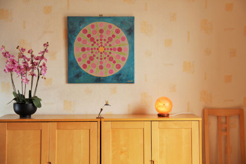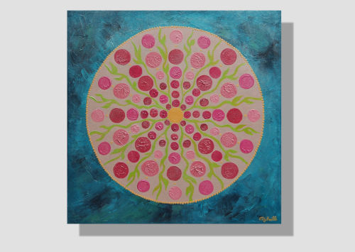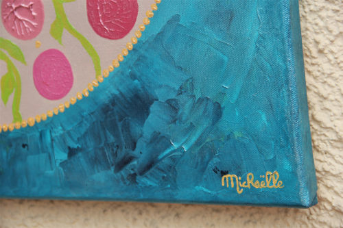Ce tableau vibratoire est une oeuvre abstraite unique et originale à l’acrylique sur toile, de dimensions 60X60 cm, peinte en 2017, signée Michaëlle.
