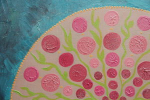 Châssis avec toile de coton, quelques effets de matière en relief, peinture au pinceau.