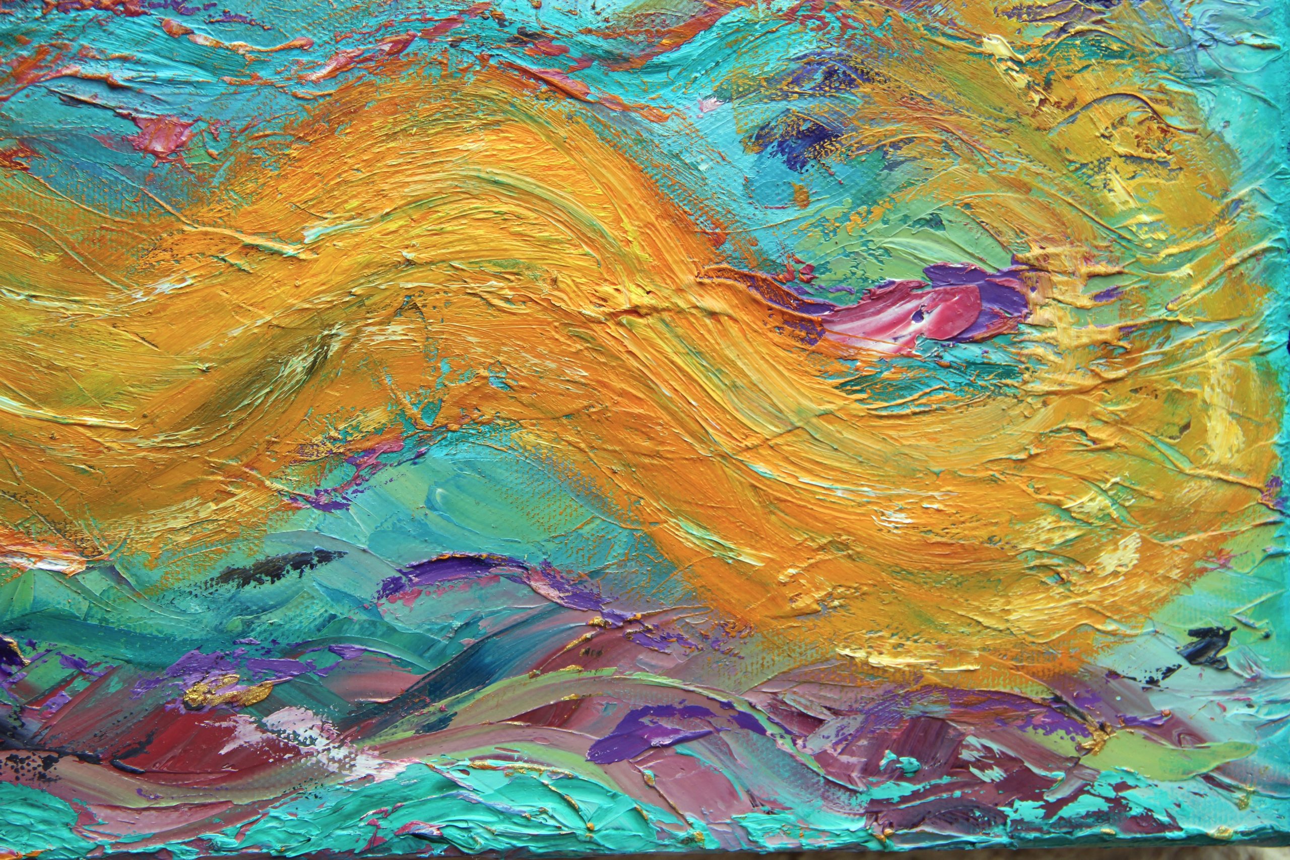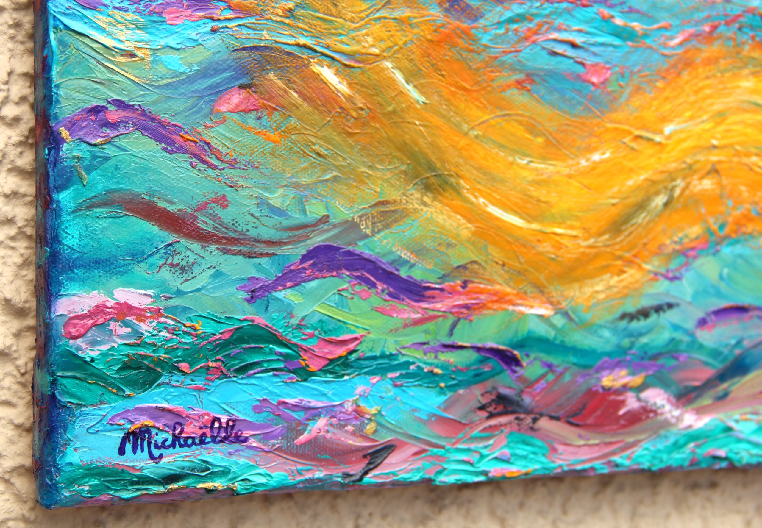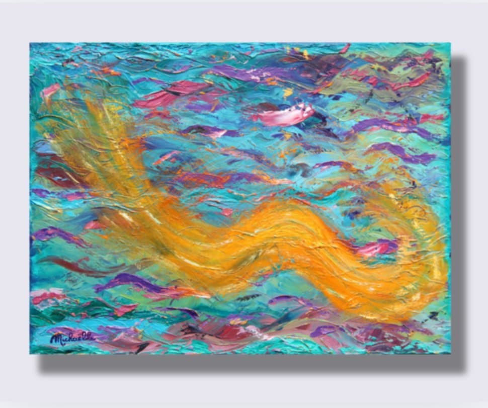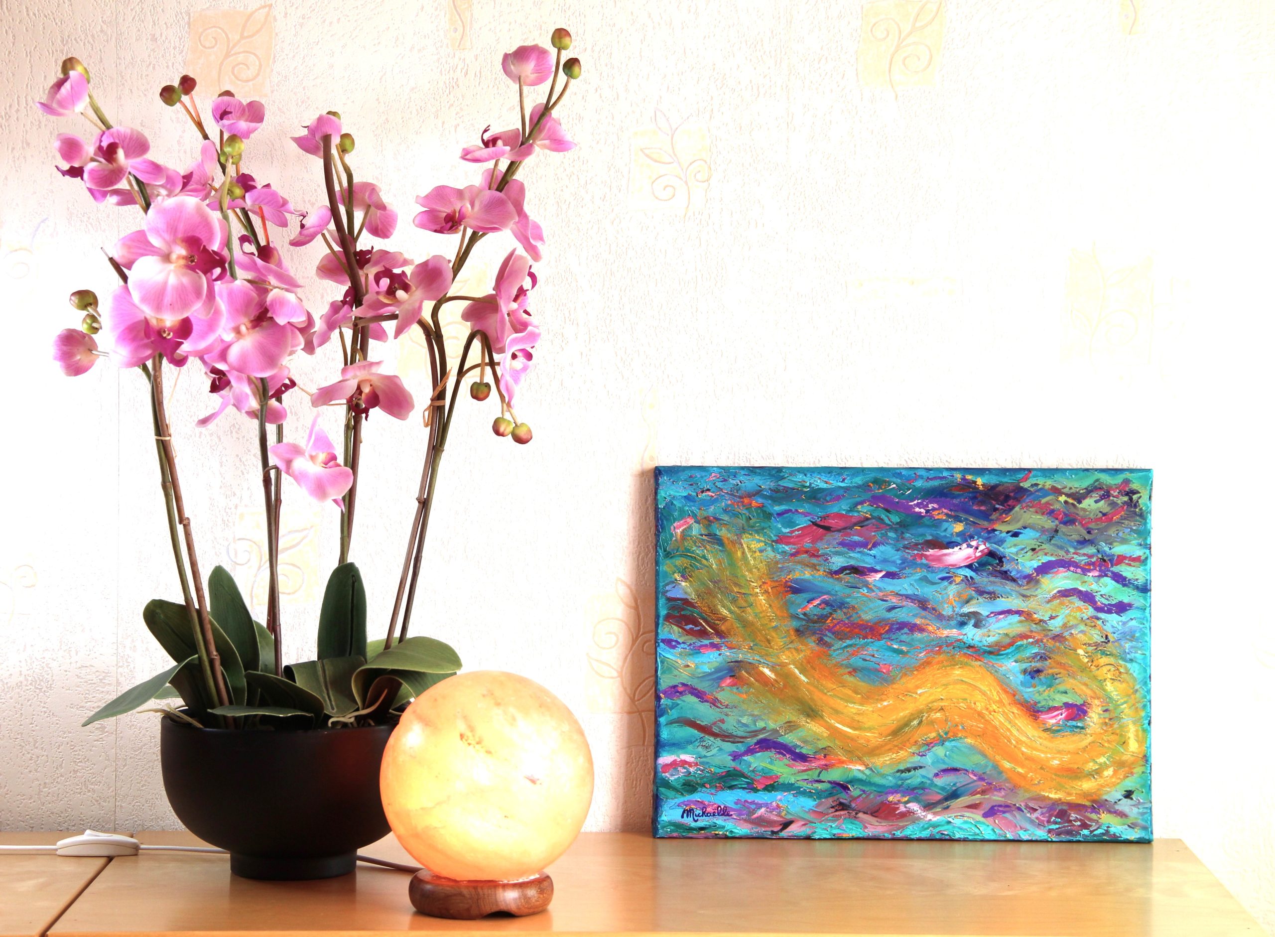 Ce tableau vibratoire est une oeuvre abstraite unique et originale à l’huile sur toile, de dimensions 30X40 cm, peinte en 2014, signée Michaëlle.