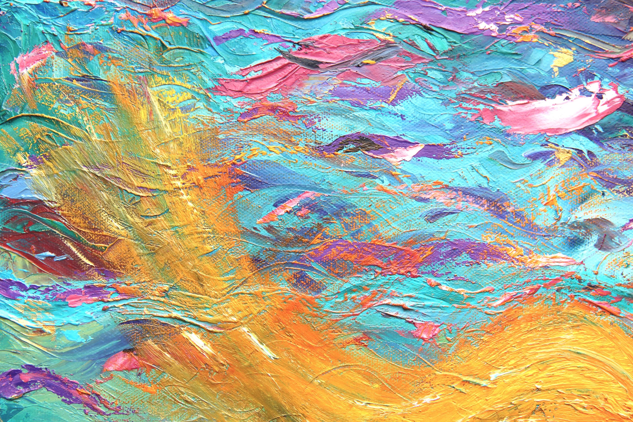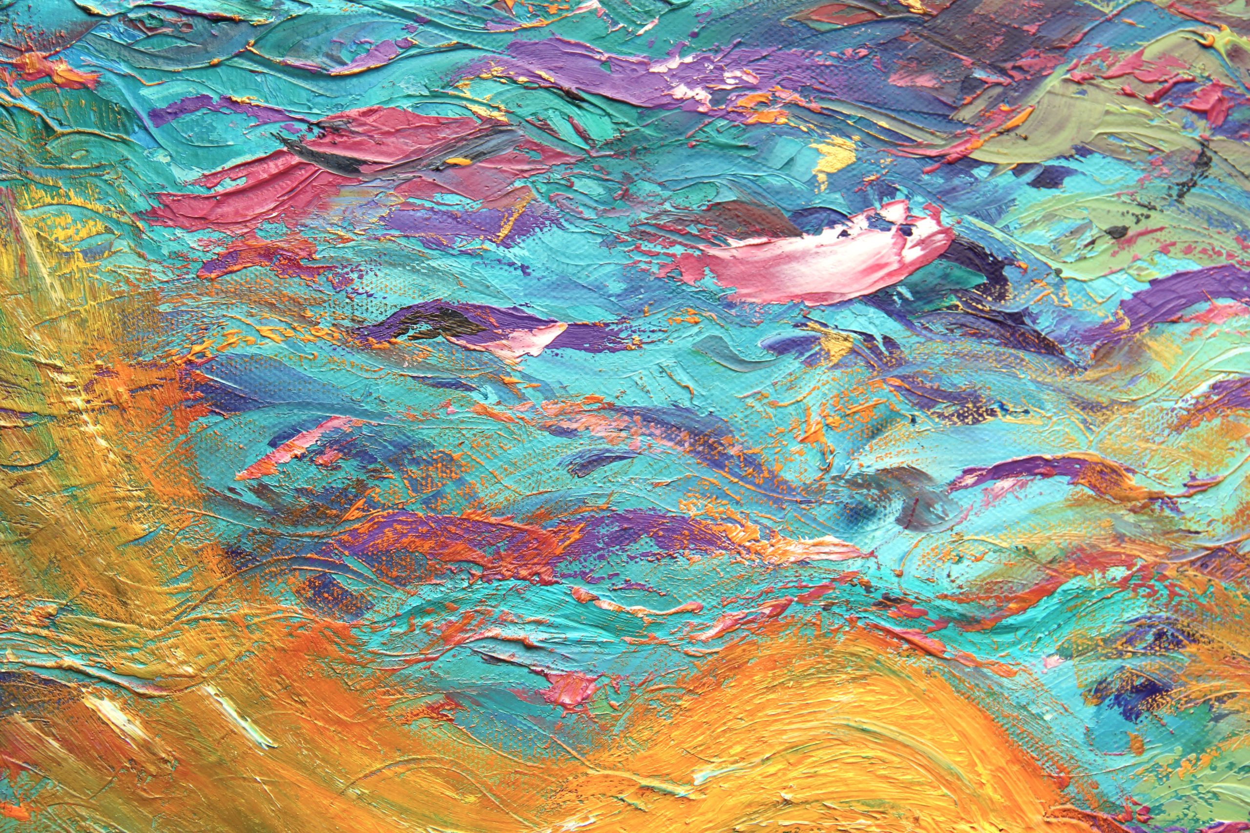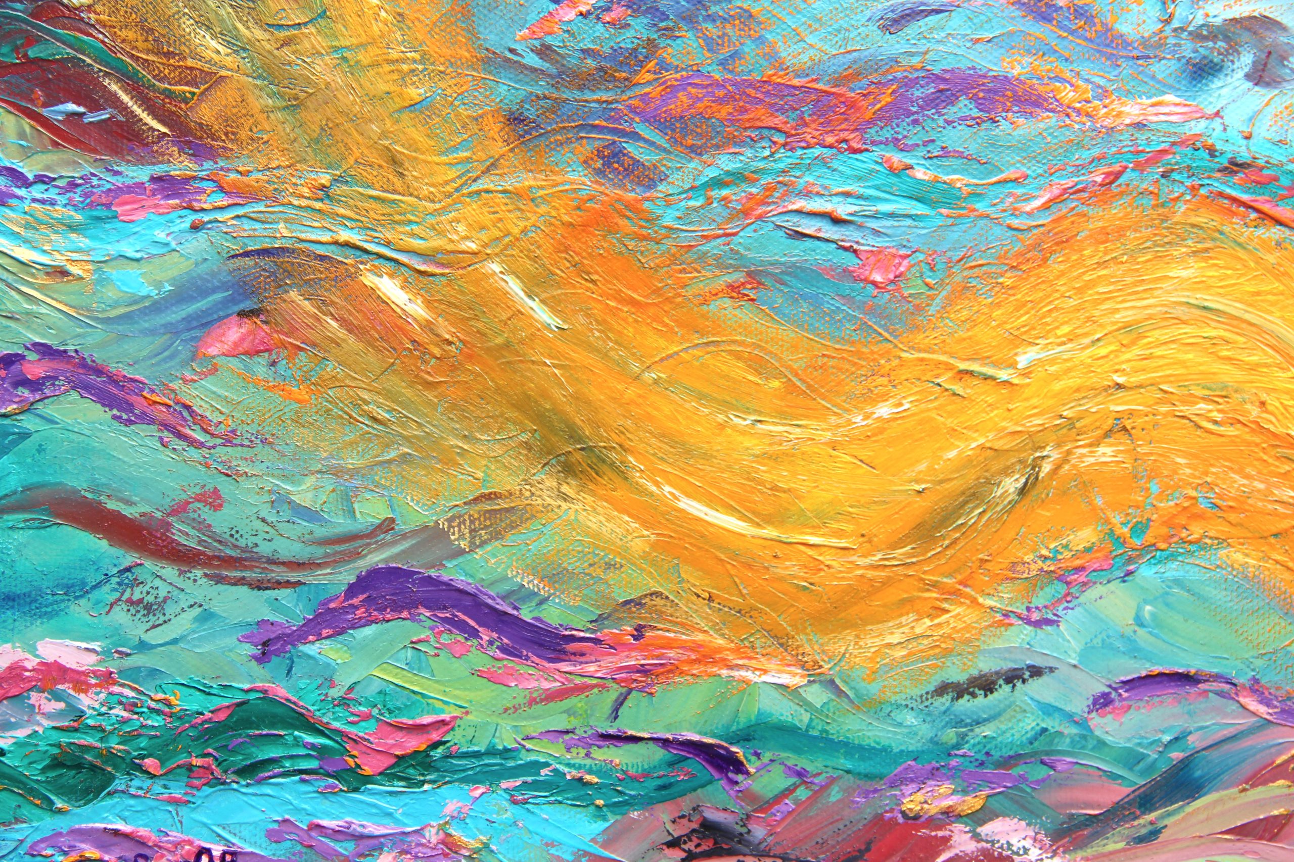 Ce tableau vibratoire est une oeuvre abstraite unique et originale à l’huile sur toile, de dimensions 30X40 cm, peinte en 2014, signée Michaëlle.