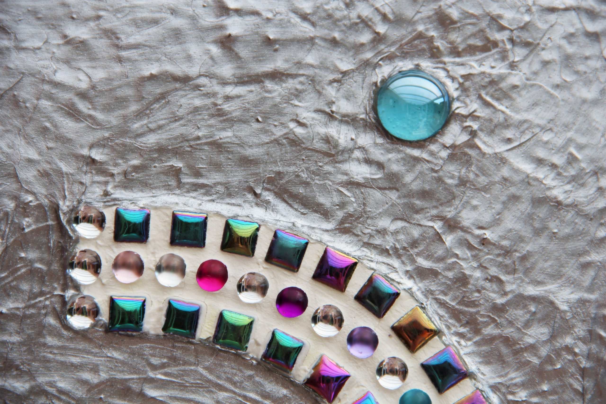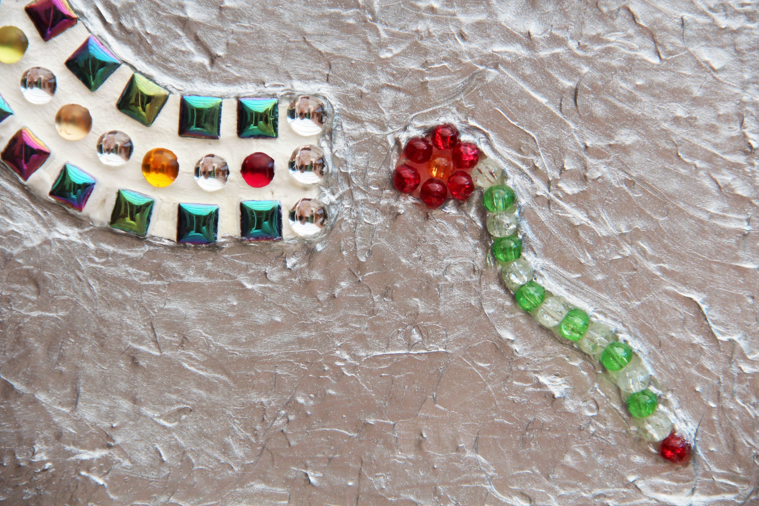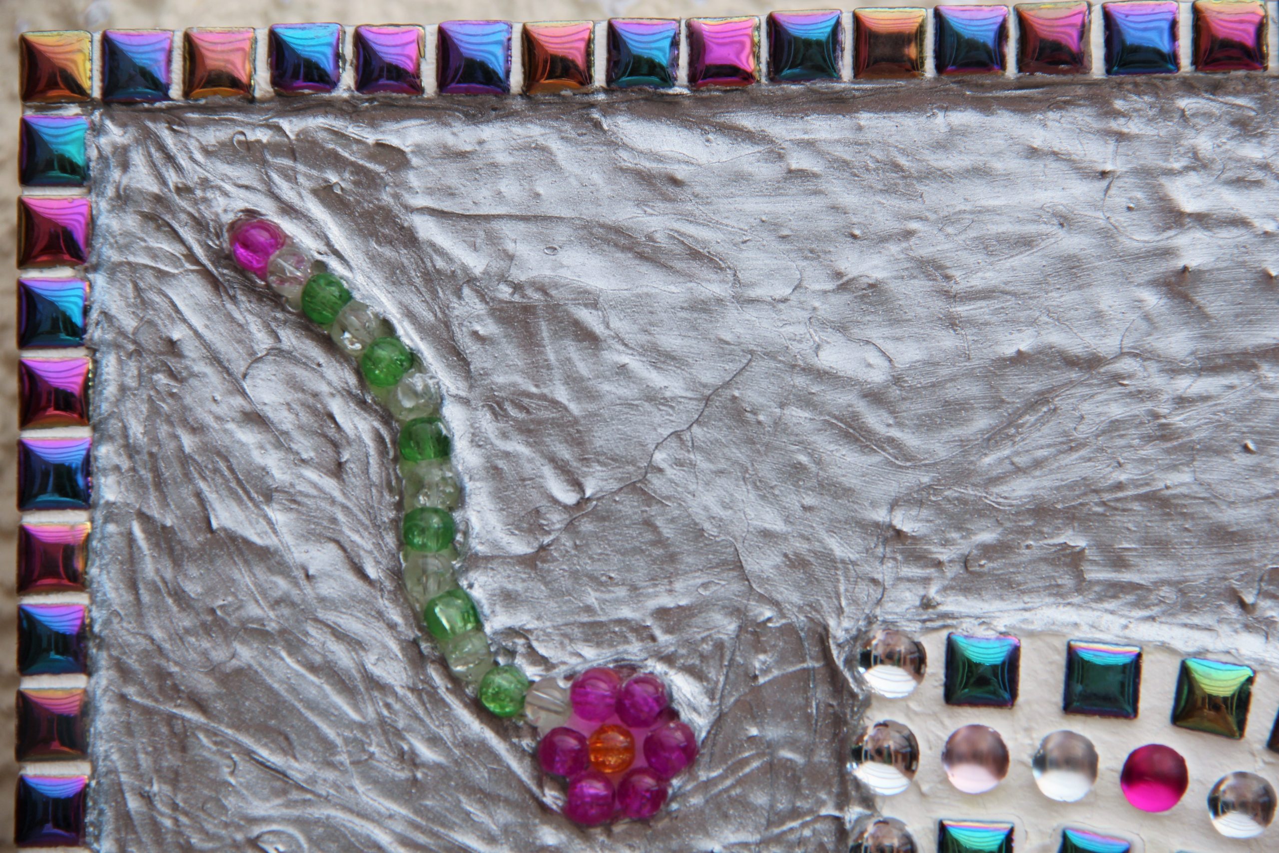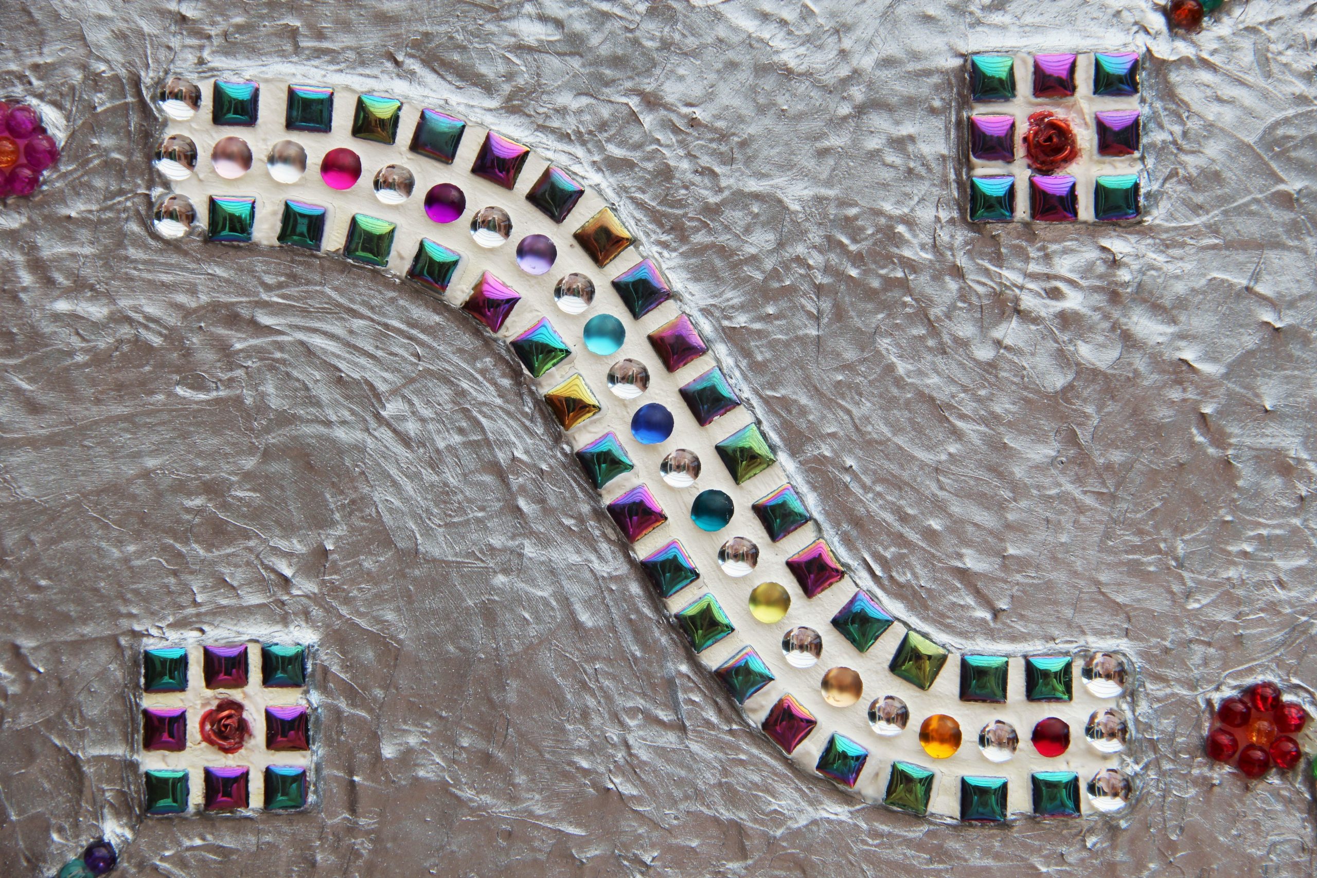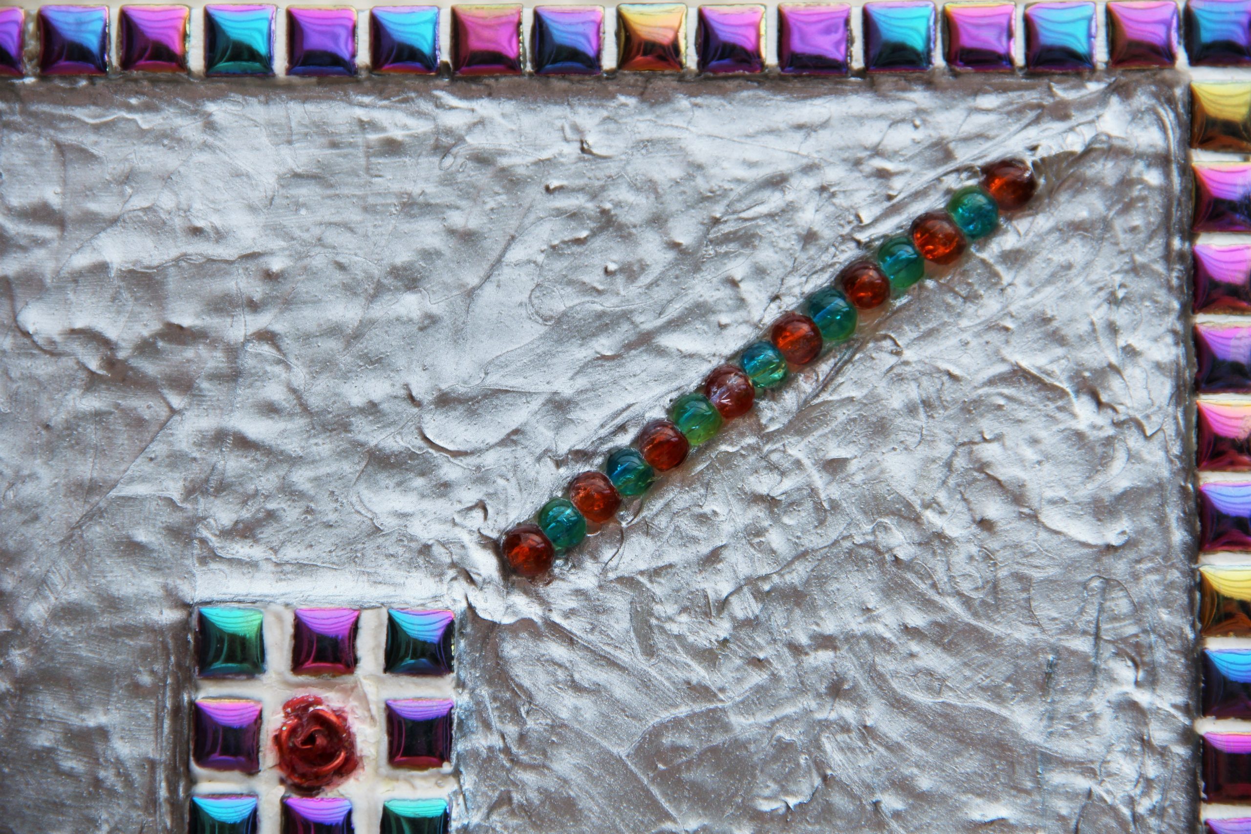Collage de mosaïques irrisées, de roses rouges en métal, de perles, de ronds en verre colorés. Ciment joint en blanc. Gel épais brillant et peinture acrylique argentée posée au couteau.